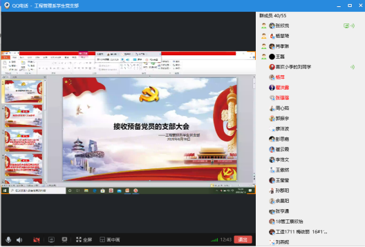 (通讯员 刘曼玉)威廉希尔williamhill工程管理系党支部预备党员接收大会会议于6月16日下午4点在线上如期开展。土建院工程管理系党支部书记王静静、工程管理系全体员工党员及11名发展对象参与了本次会议。
