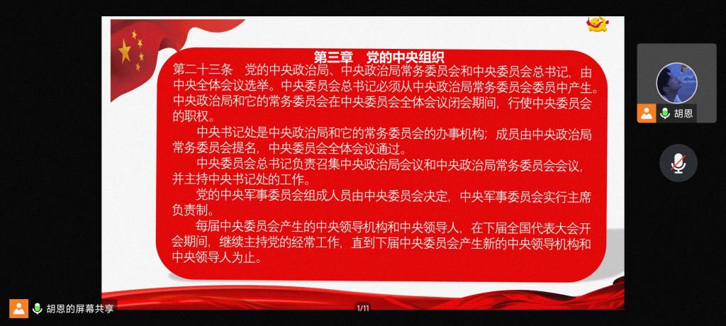 本次党日活动围绕七项内容展开。第一项,全体起立,奏唱国歌《义勇军进行曲》;第二项,全体员工党员重温入党誓词;第三项,由胡恩同志带领大家学习并诵读《中国共产党章程》,增强对党的认识,加深政治信仰;第四项,孔玉铭同志带领大家学习《习近平总书记在江泽民同志追悼大会上的悼词》并在发言中提到:“我们深切缅怀江泽民同志的丰功伟绩和崇高风范,从中汲取砥砺前行的奋进力量。深刻把握“三个代表”重要思想的重大理论贡献,不断开辟马克思主义中国化时代化新境界。继承江泽民同志的遗志,更加紧密地团结在以习近平同志为核心的党中央周围,为全面建设社会主义现代化国家、全面推进中华民族伟大复兴而团结奋斗。”;第五项,杨颖同志为大家讲党课;第六项,各支部交流发言,何雨桐、王云松和陈萌琦依次发言;第七项。各支部小组相互讨论,党员们分别根据中央纪委国家监委工作汇报和2023年党风廉政建设和反腐败工作等方面,表示自己在今后要把自我革命精神贯彻落实到学习工作中。