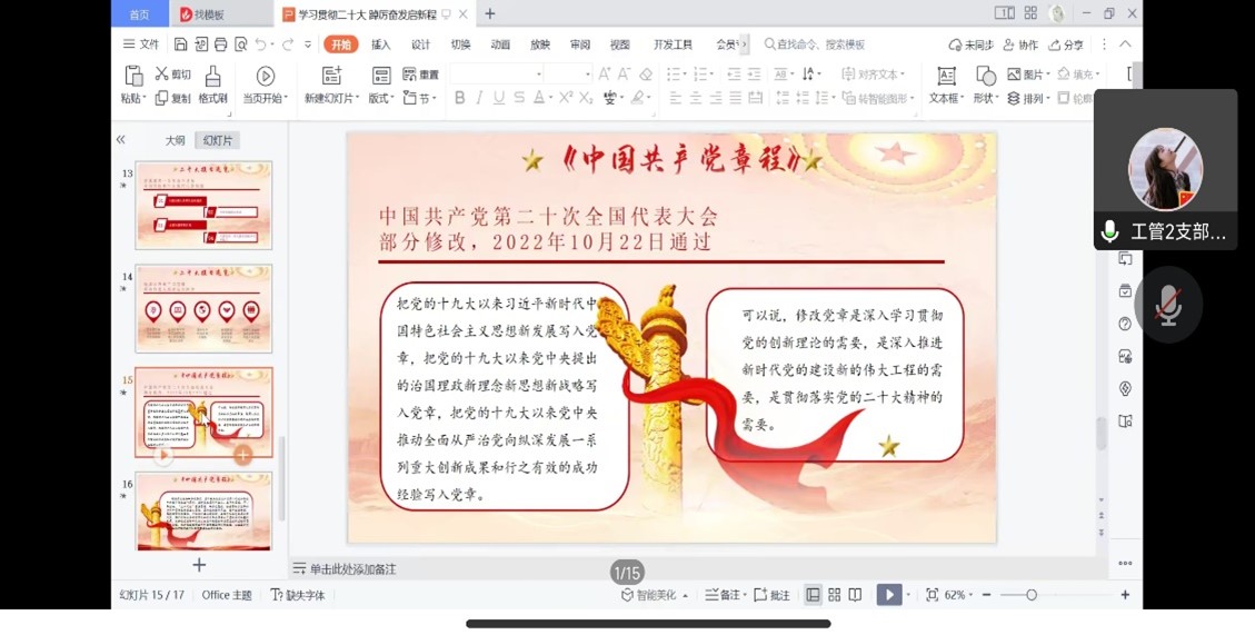 (通讯员 刘玉婷)2022年11月26日下午六点三十分,威廉希尔williamhill全体党员线上开展了以“学习贯彻党的二十大精神 砥砺奋发启新程”为主题的党日活动。